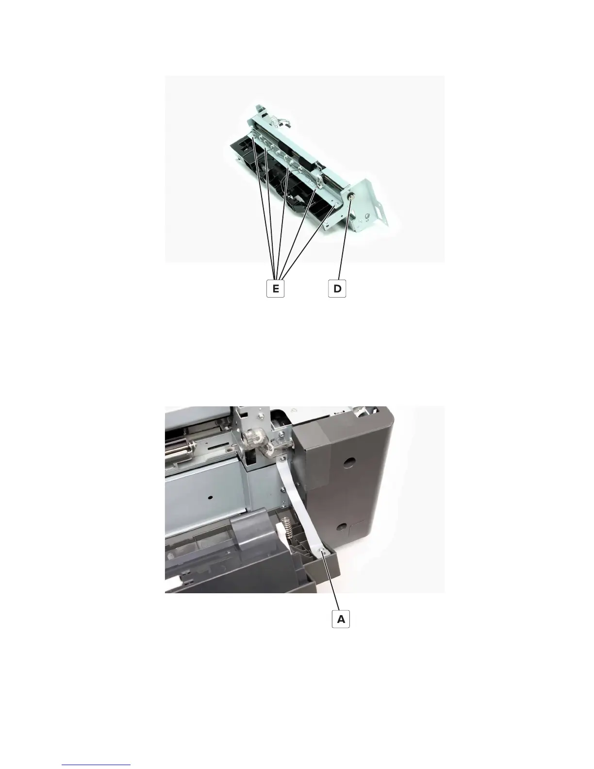 4 Remove the clip on the left side (D), and then remove the five screws (E).