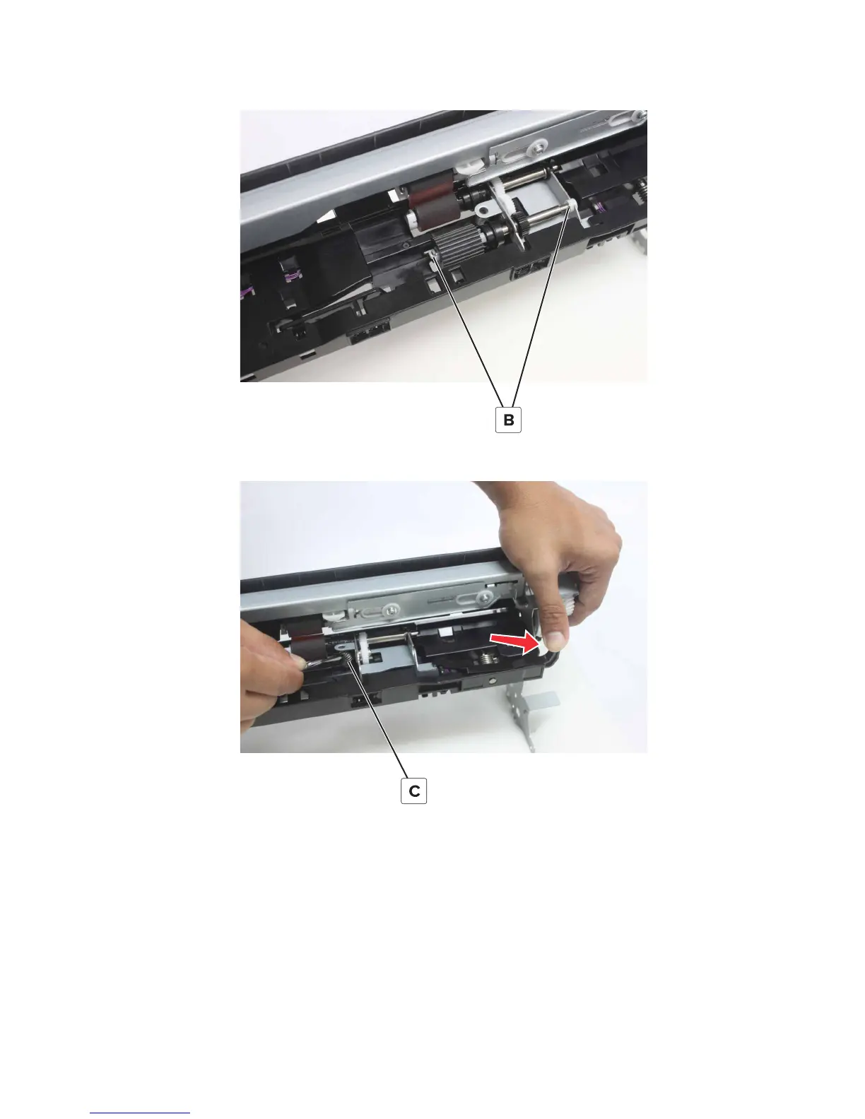 4 Press the lever, remove the spring (C), and then install the replacement spring from step 2.