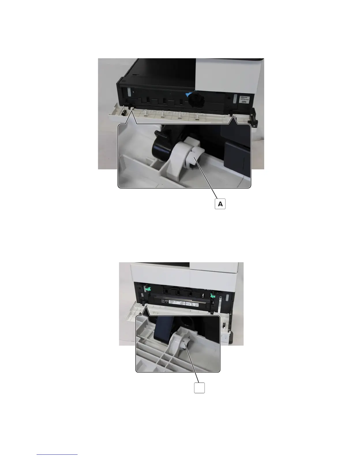 1 Open the door, and then remove the two clips (A).
