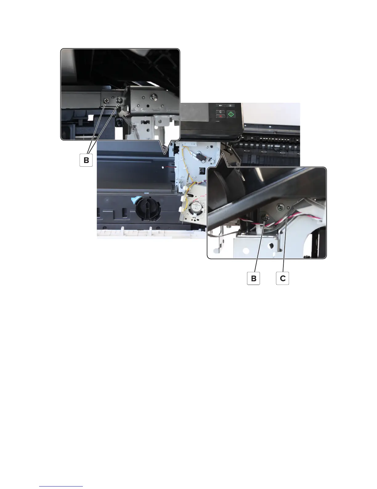 3 Remove the three screws (B), and then disconnect the control panel board cable (C).