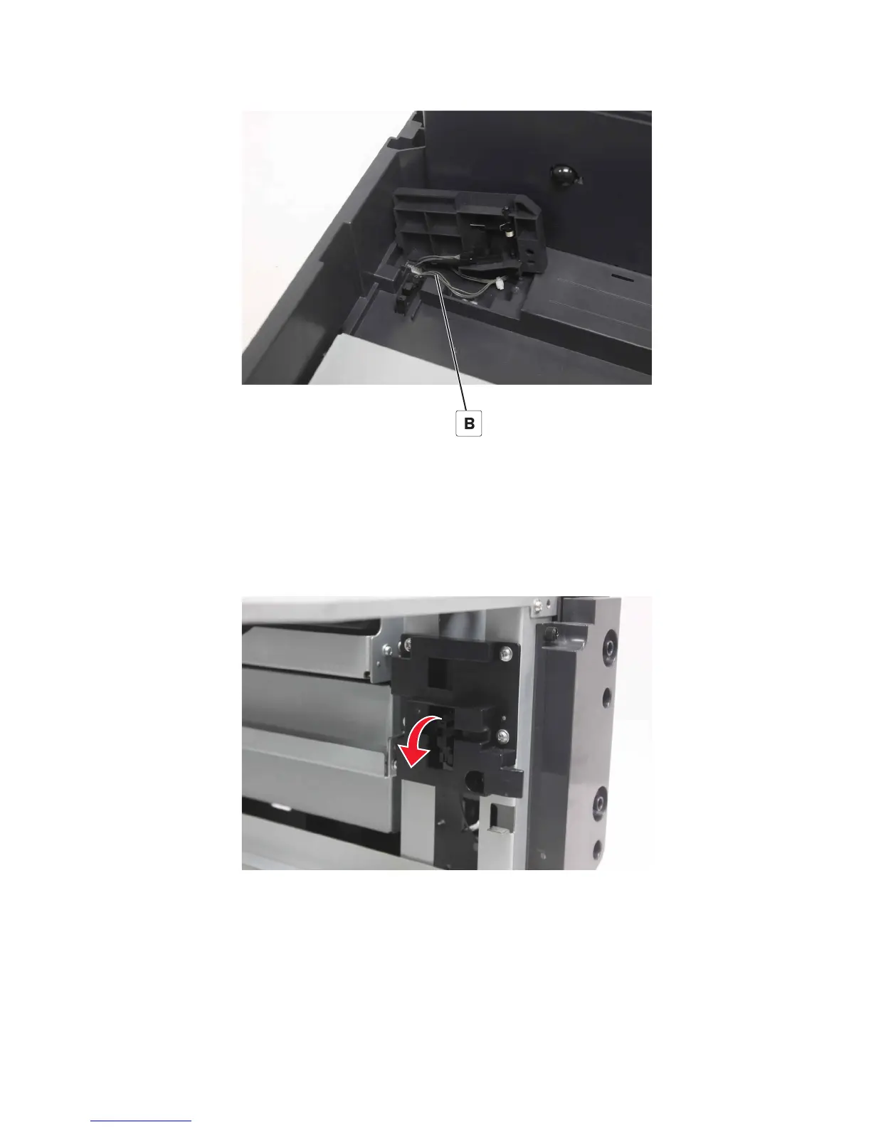 3 Swing open the cover, and then disconnect the cable (B).