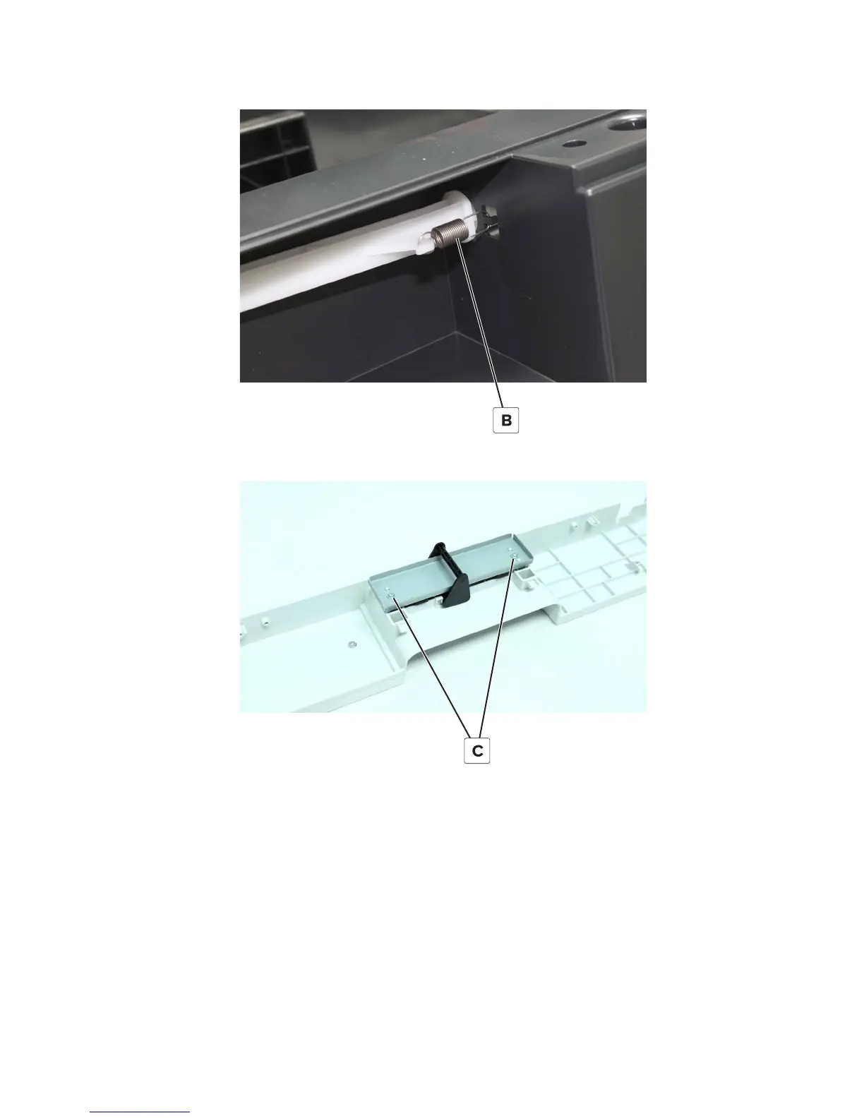 4 Disconnect the spring (B) from the tray, and then remove the shaft.