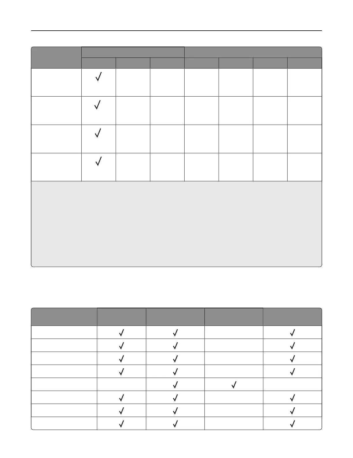 Paper types supported by the standard tray, MPF, envelope tray, and two‑sided printing