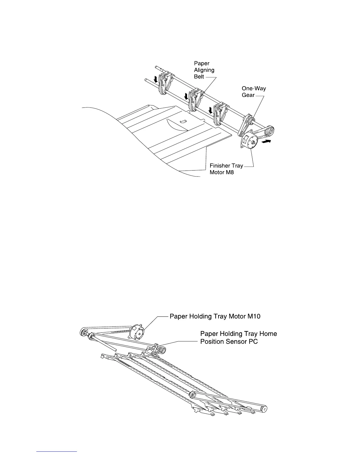 The paper holding tray motor drives gears and belts which move the