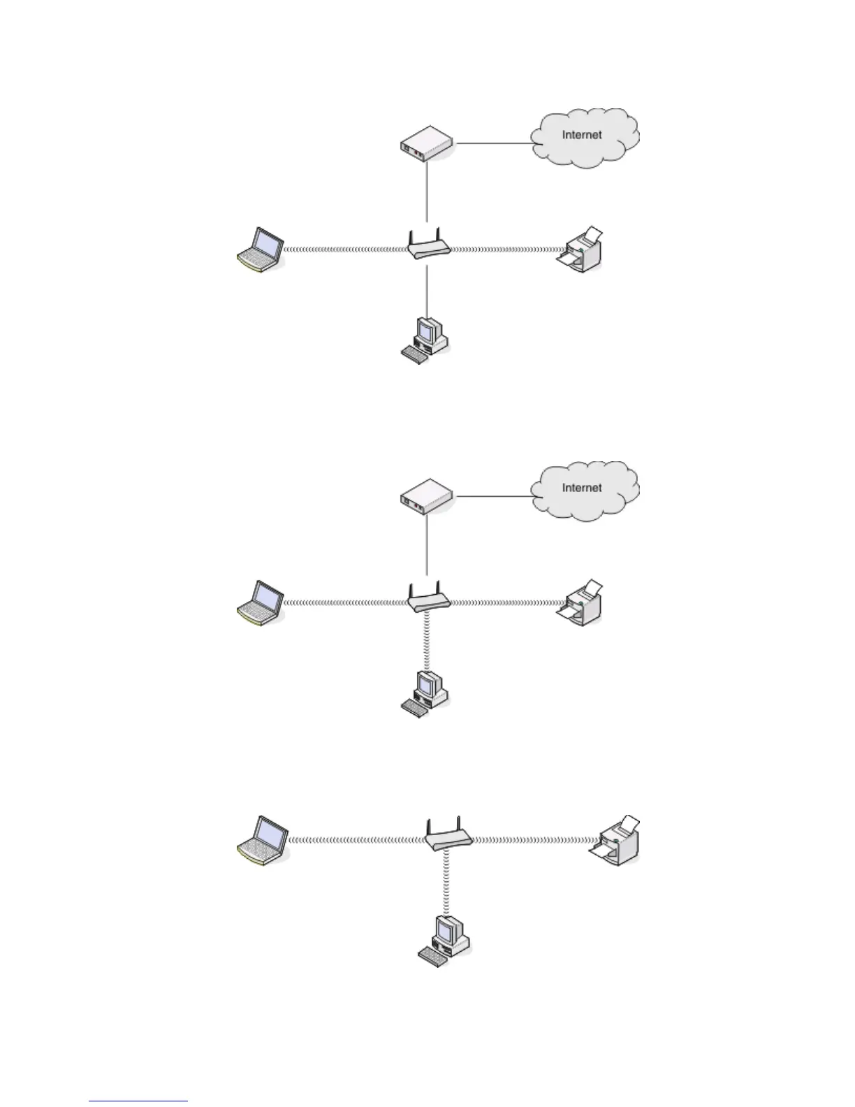 All computers and printers connect to the network using a wireless access point or wireless router.