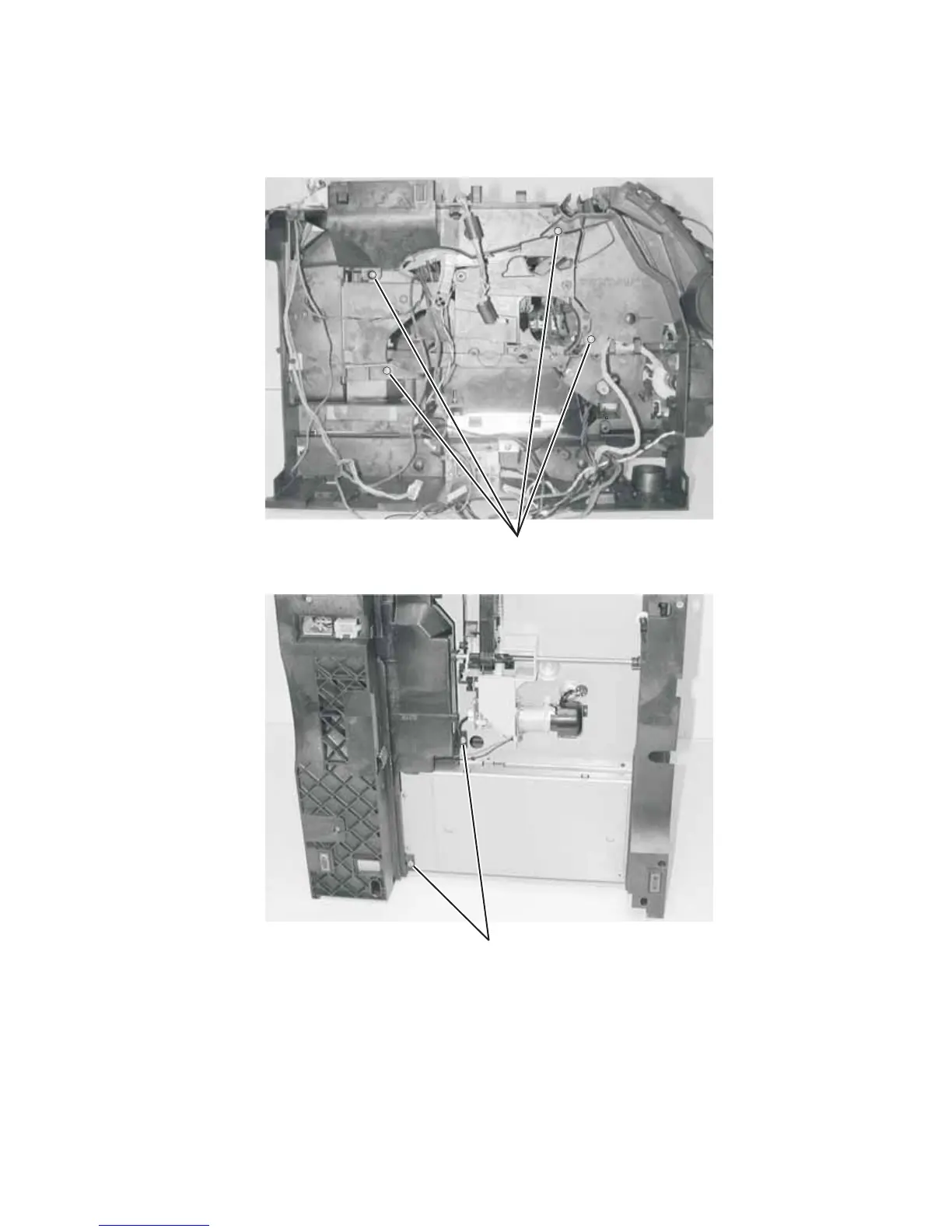 8. Place the printer on its back and remove the left side frame mounting screws (B).