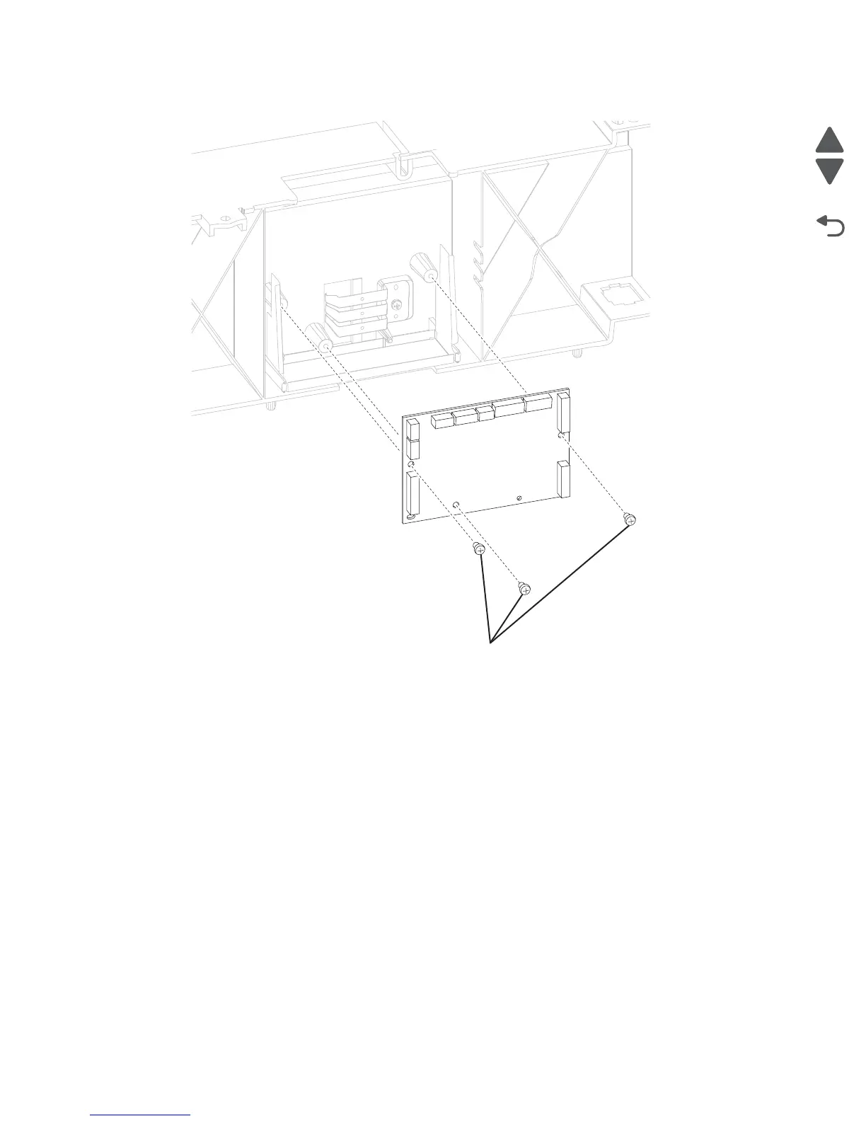 3. Remove the three screws (A) securing the 550-sheet controller card assembly to the 550-sheet frame.