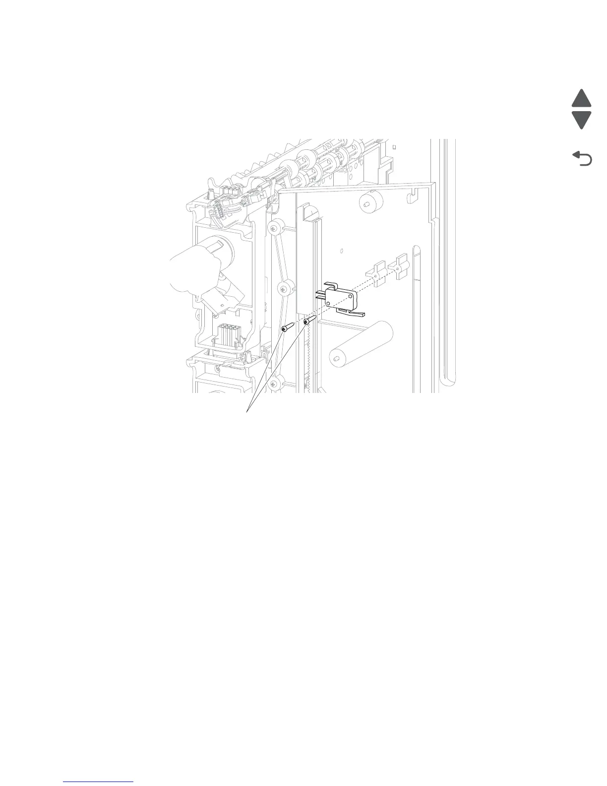 2. Remove the two screws (A) securing the high capacity stacker switch (media bin HP) to the left frame.