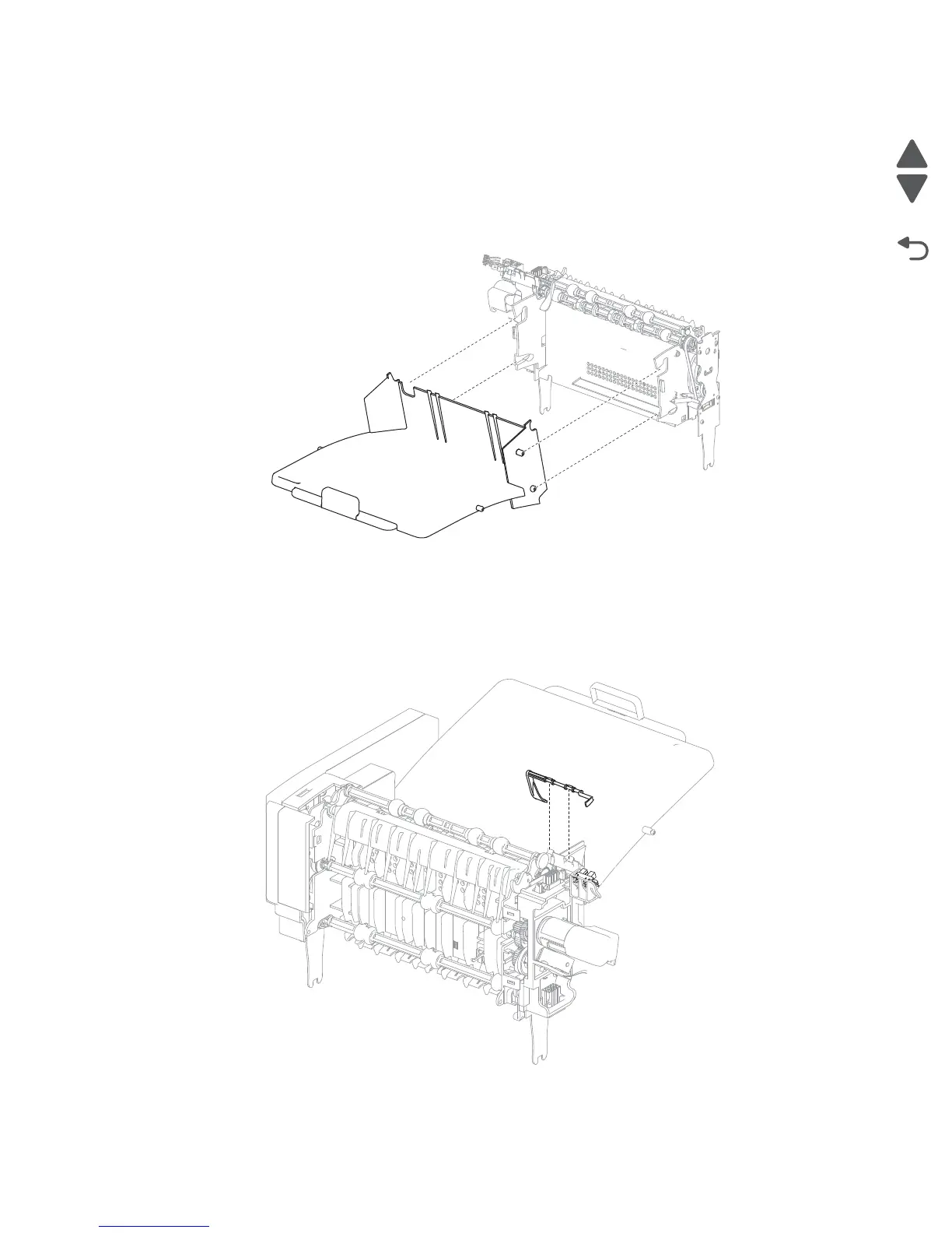 3. Rotate the output bin assembly downward and out of the slots to remove.