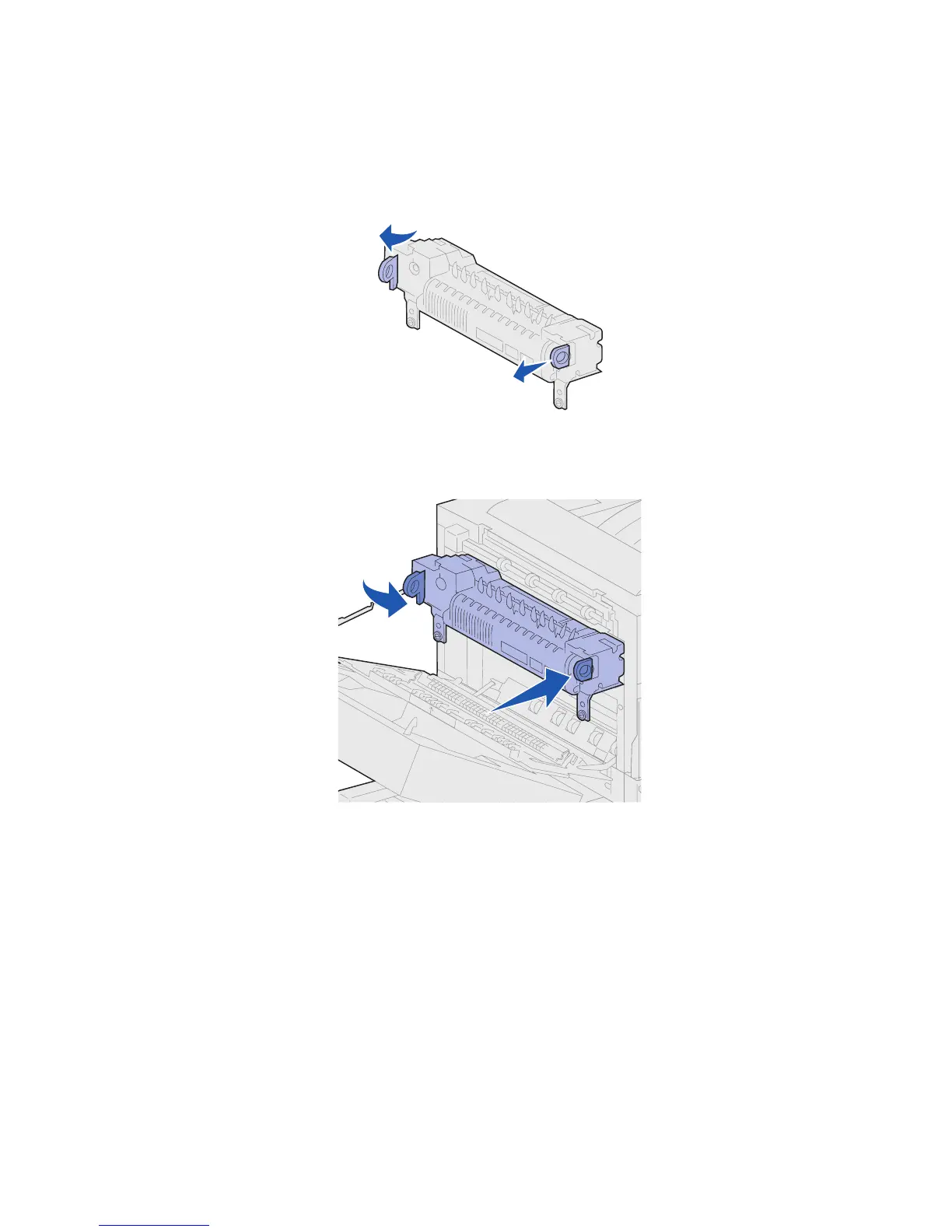 Note: Push firmly on each side of the fuser near the handles until it is in place.