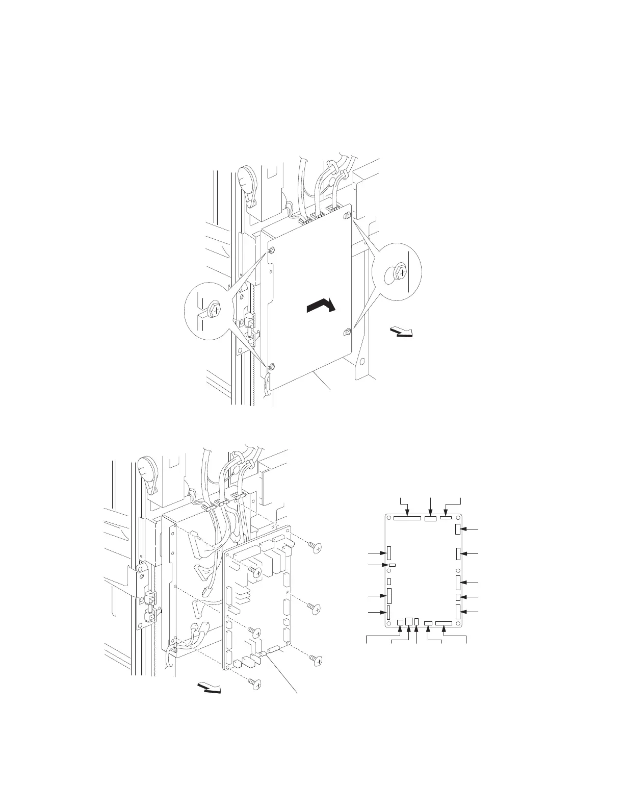 8. Remove the finisher controller card assembly (B).