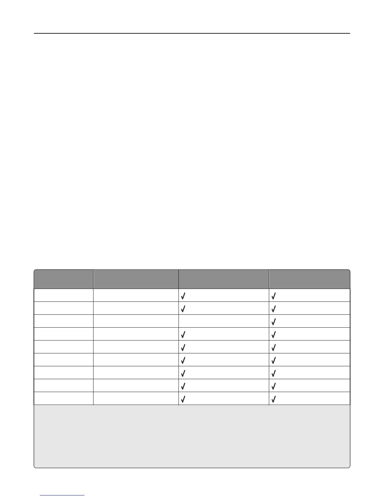 The following tables provide information on standard and optional paper sources and the types of paper they support.