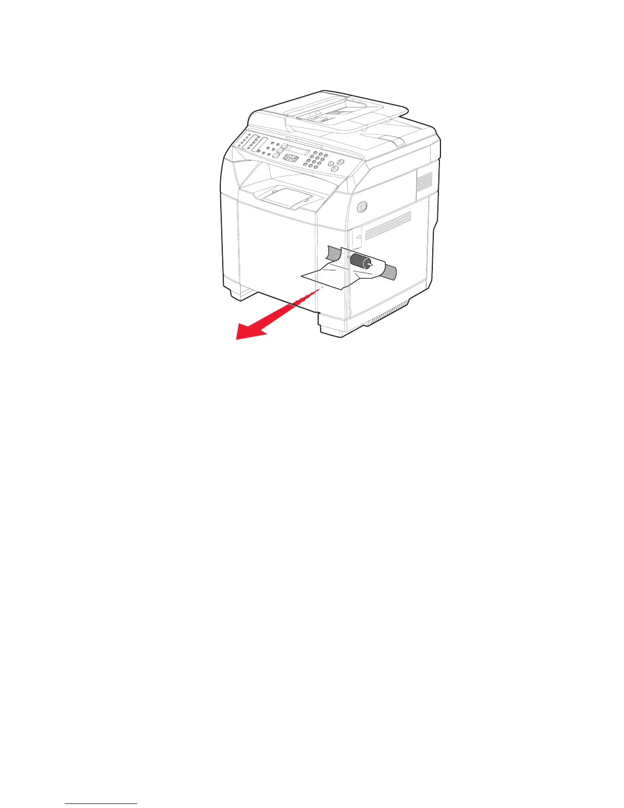 reach far under the printer to locate the jam, as shown in the following illustration. Pull the jam straight out.