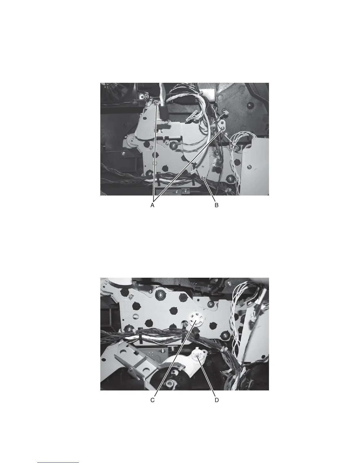 2. Remove the two short screws (A) and the one long screw (B) securing the developer drive assembly.