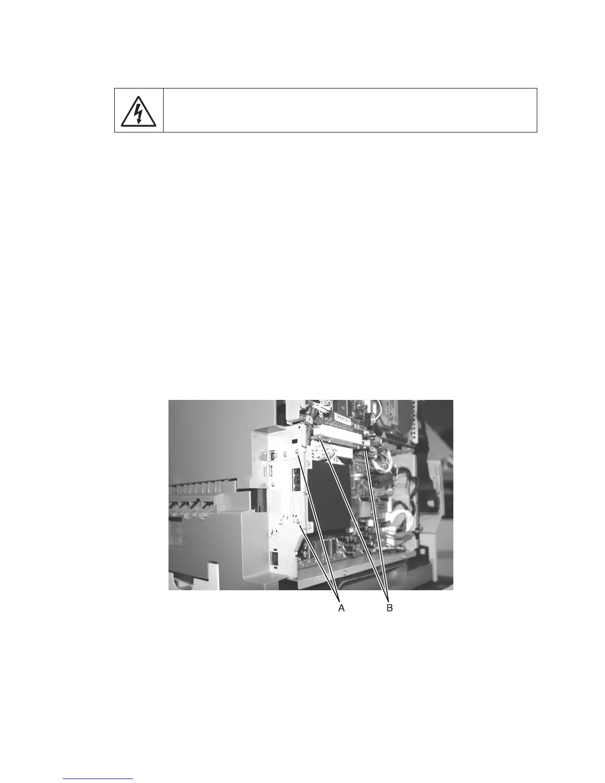 3. Remove the two screws securing the interface card (B).