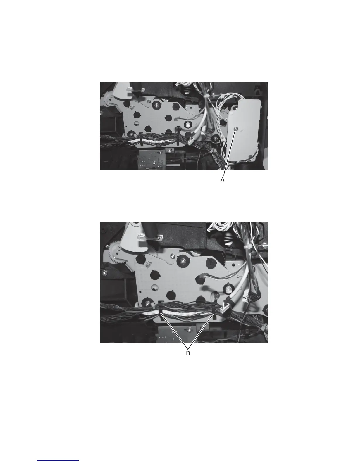 5. Lift and remove the cables from the cable hooks (B).