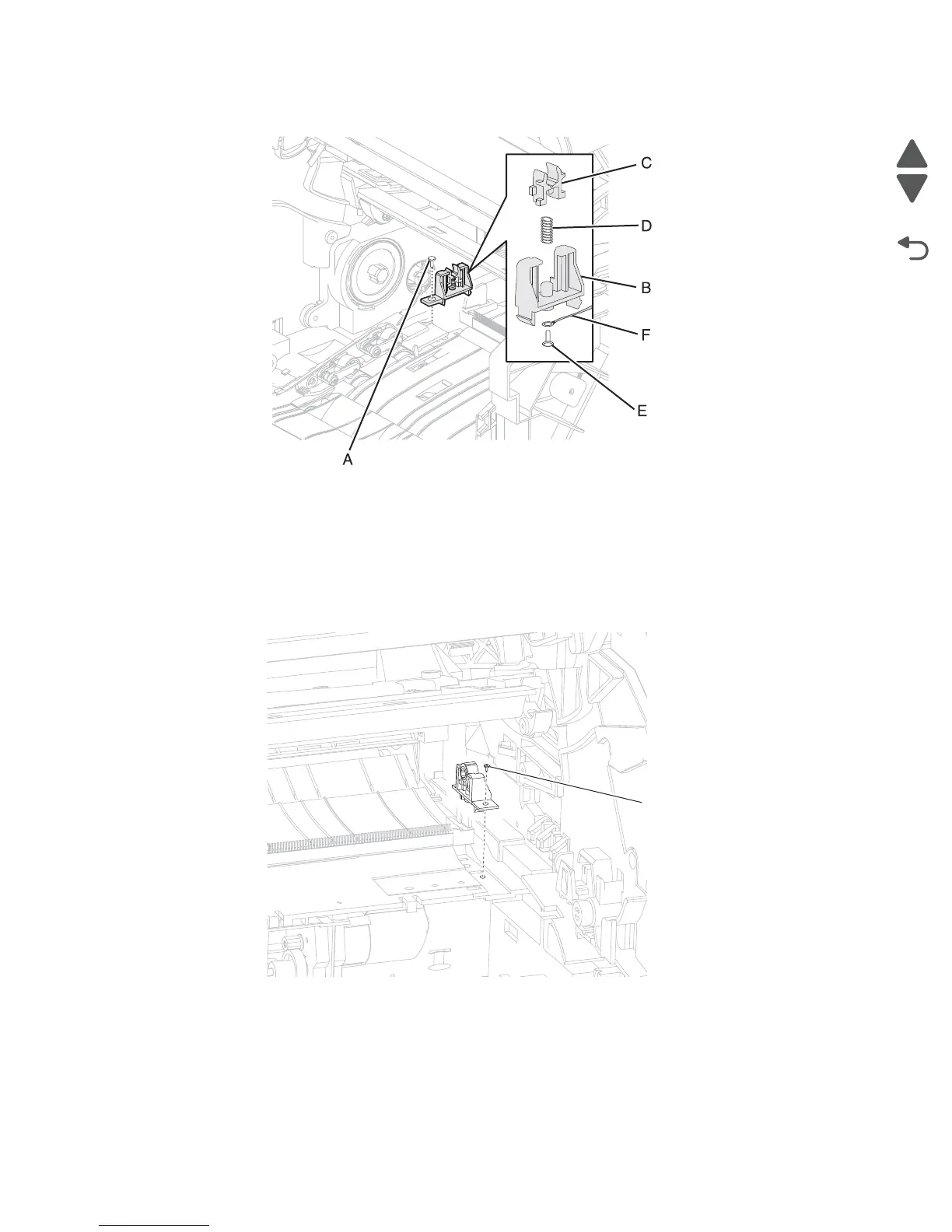 Replacement Warning: When reinstalling the transfer roll bracket assembly, left, ensure that the bushing (C),