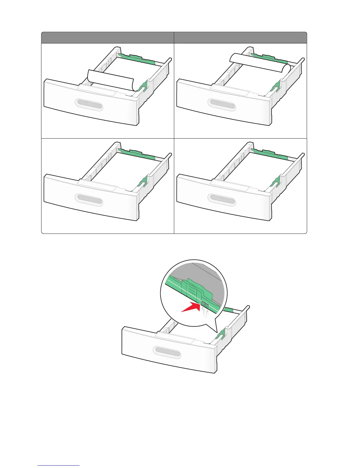 6 If necessary, adjust the paper guides to lightly touch the sides of the stack, and lock the length guide for the paper