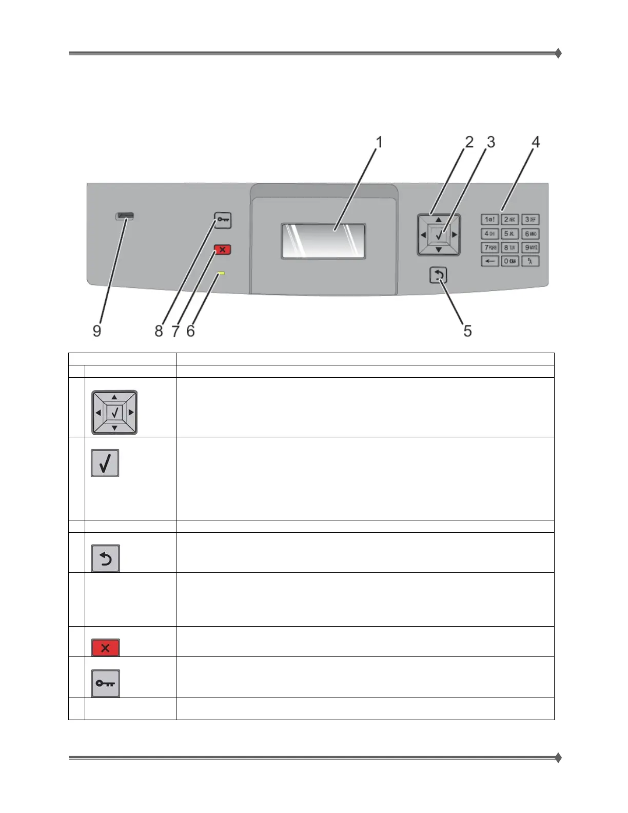 1 Display Shows messages and pictures that communicate the status of the printer.