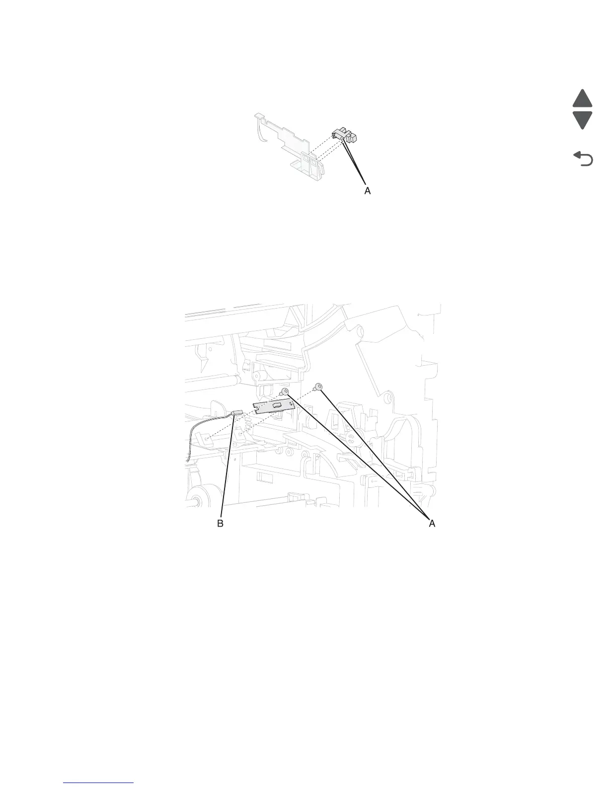 1. Release the hooks (A) securing the sensor (standard bin exit) actuator to the assembly.