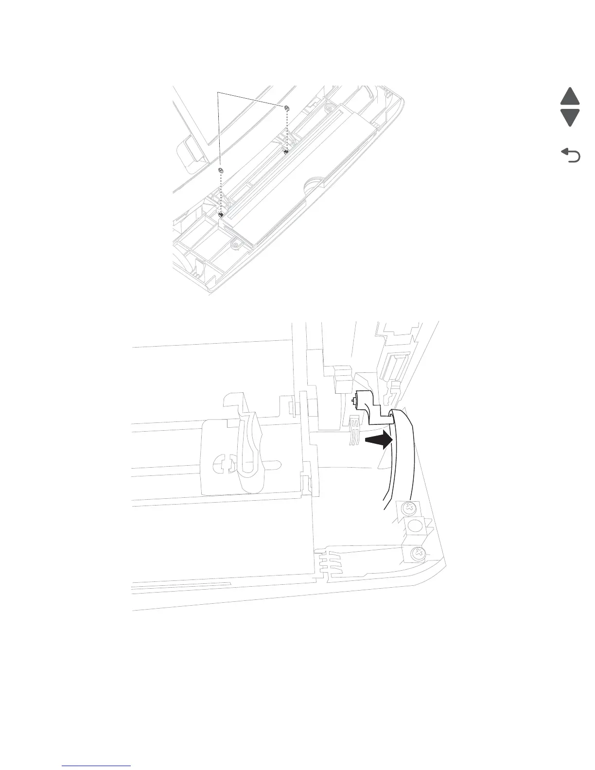 4. Slide the MPF input tray towards the front, and remove two clips (A) securing the MPF door hinges.