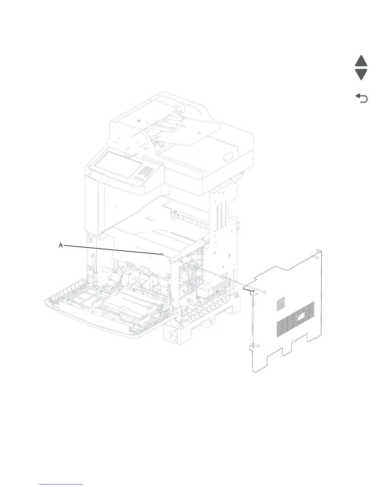 4. Remove the screw (A), and pull the side cover, right up and out to remove.