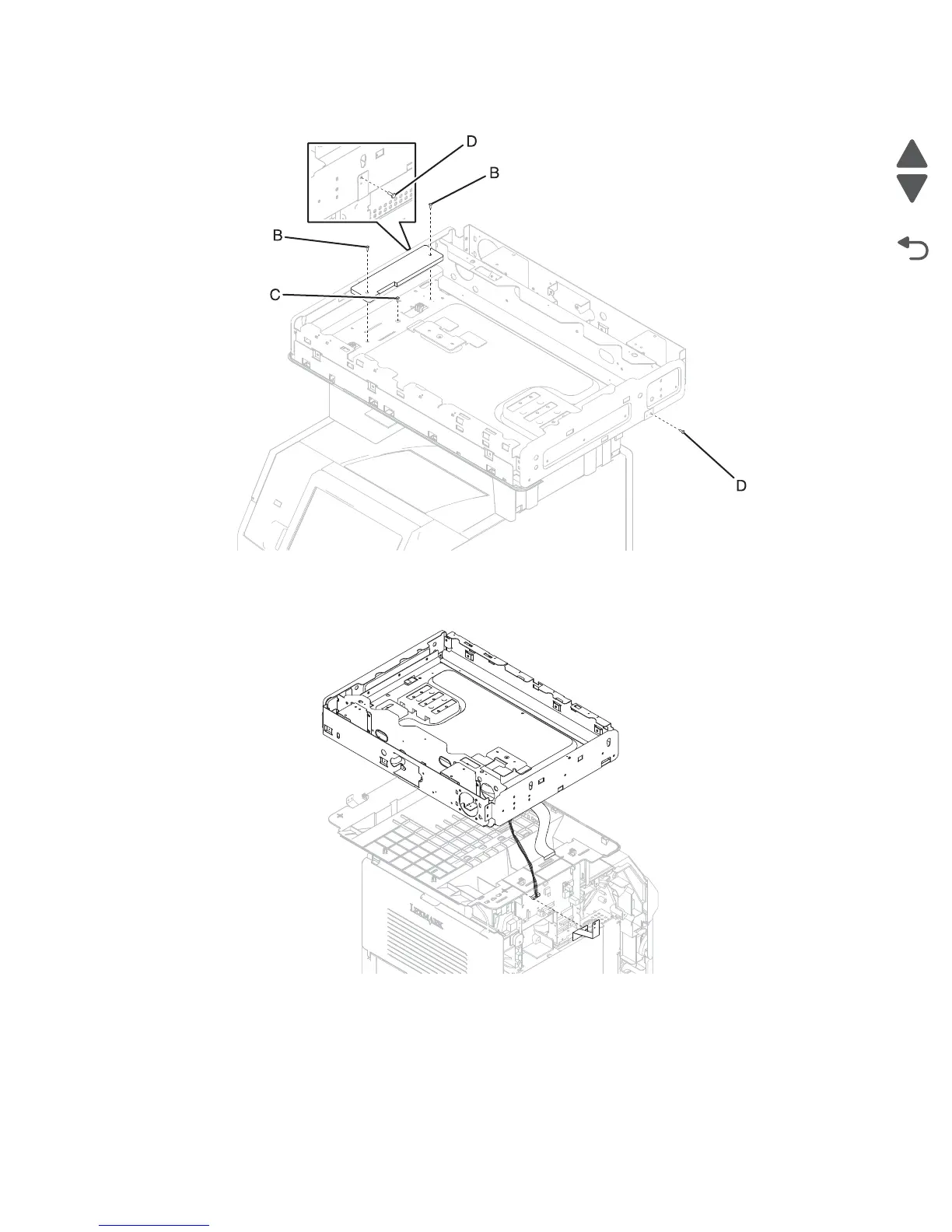 6. Remove the two screws (D) securing the ground straps to the either side of the scanner frame.