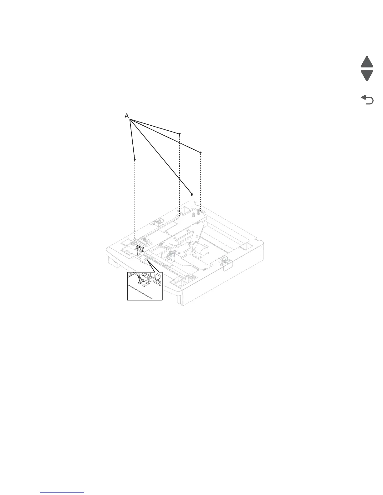 4. Remove the four screws (A) securing the 250-sheet frame assembly to the drawer.