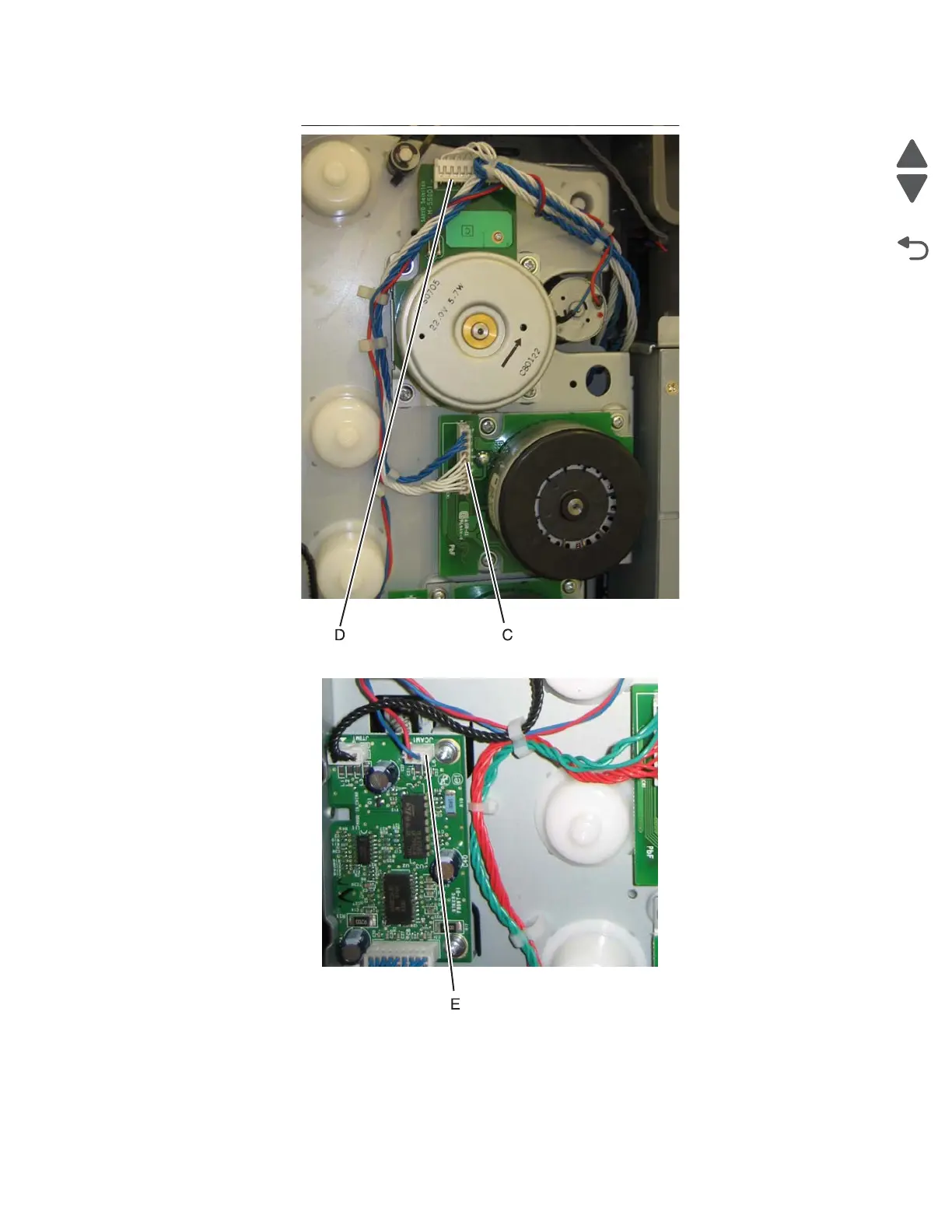3. Disconnect the connectors from the cartridge motor 1 (C) and the fuser motor (D).