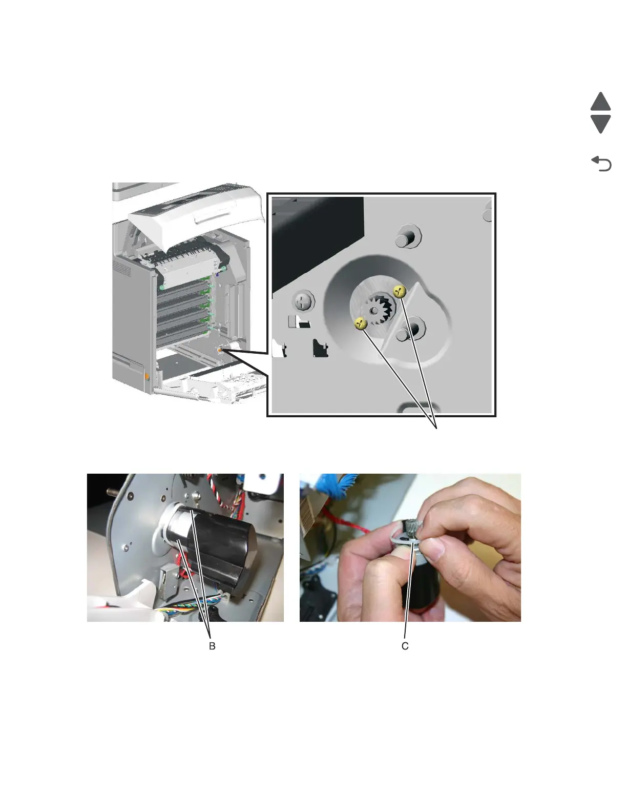 3. Remove the two multipurpose feeder/duplex motor mounting screws (A).