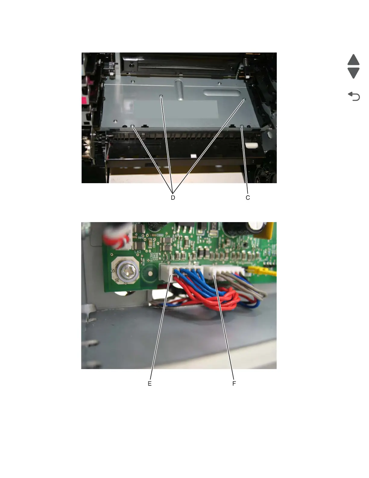 12. Route the cables through the hole in the frame, and connect them to JFDPCK1 (E) and JTRAY1 (F).