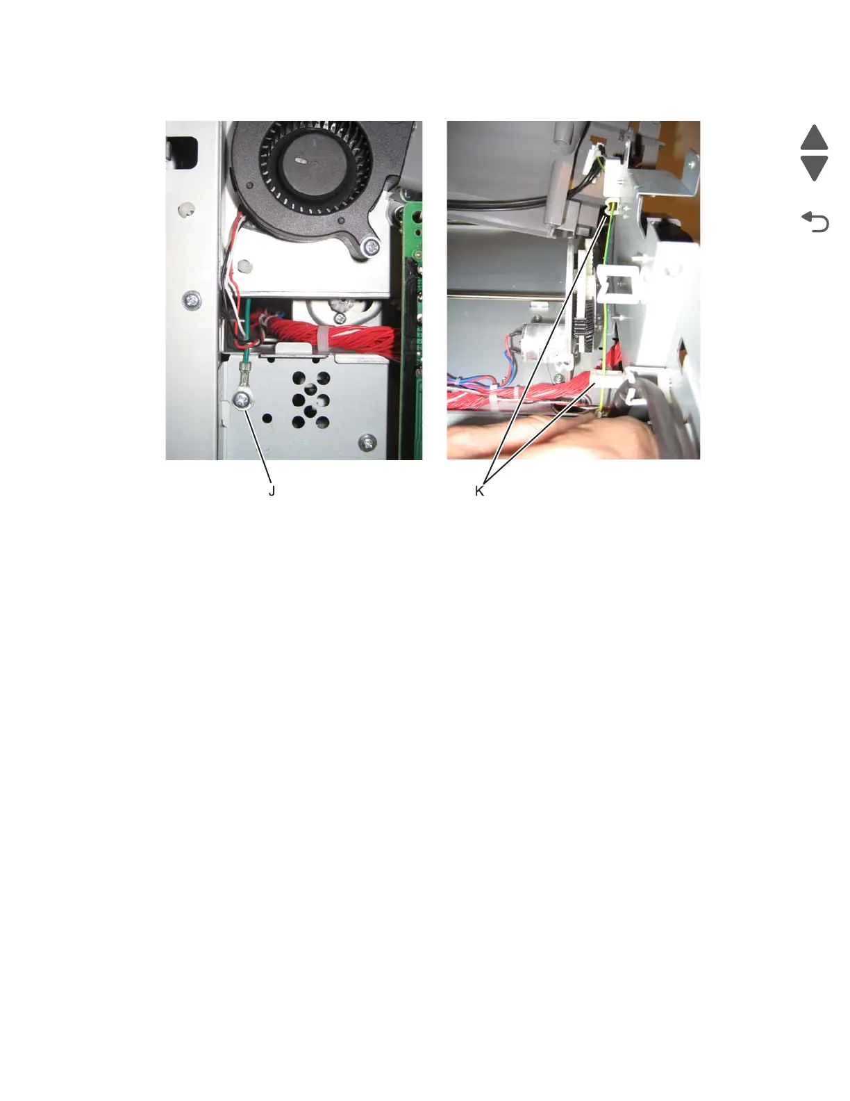 9. Remove the ground screw (J) on the right side, and remove the ground cable from the cable restraint (K).