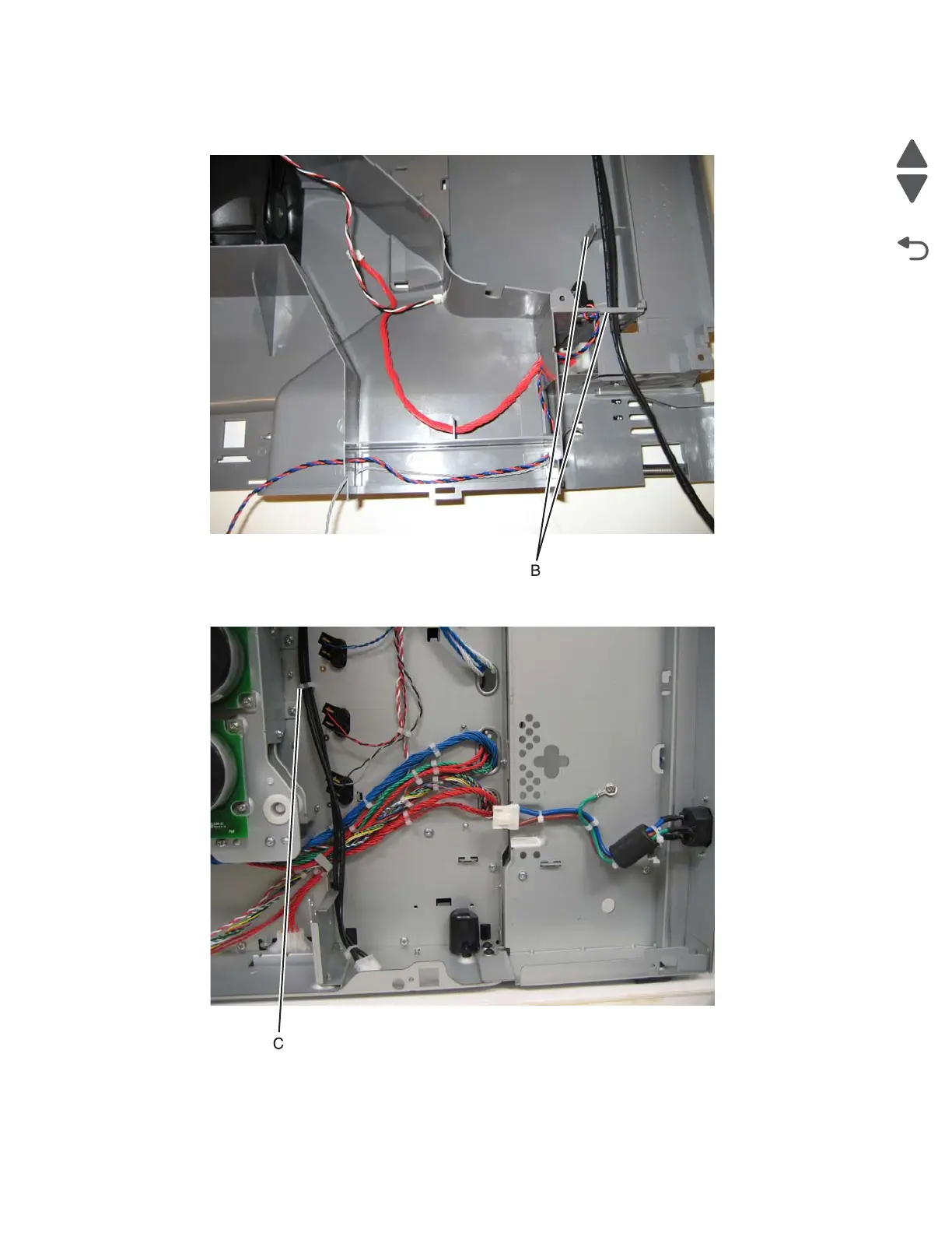 5. Remove the cable from the cable restraint (C) on the right side, and remove the cable.
