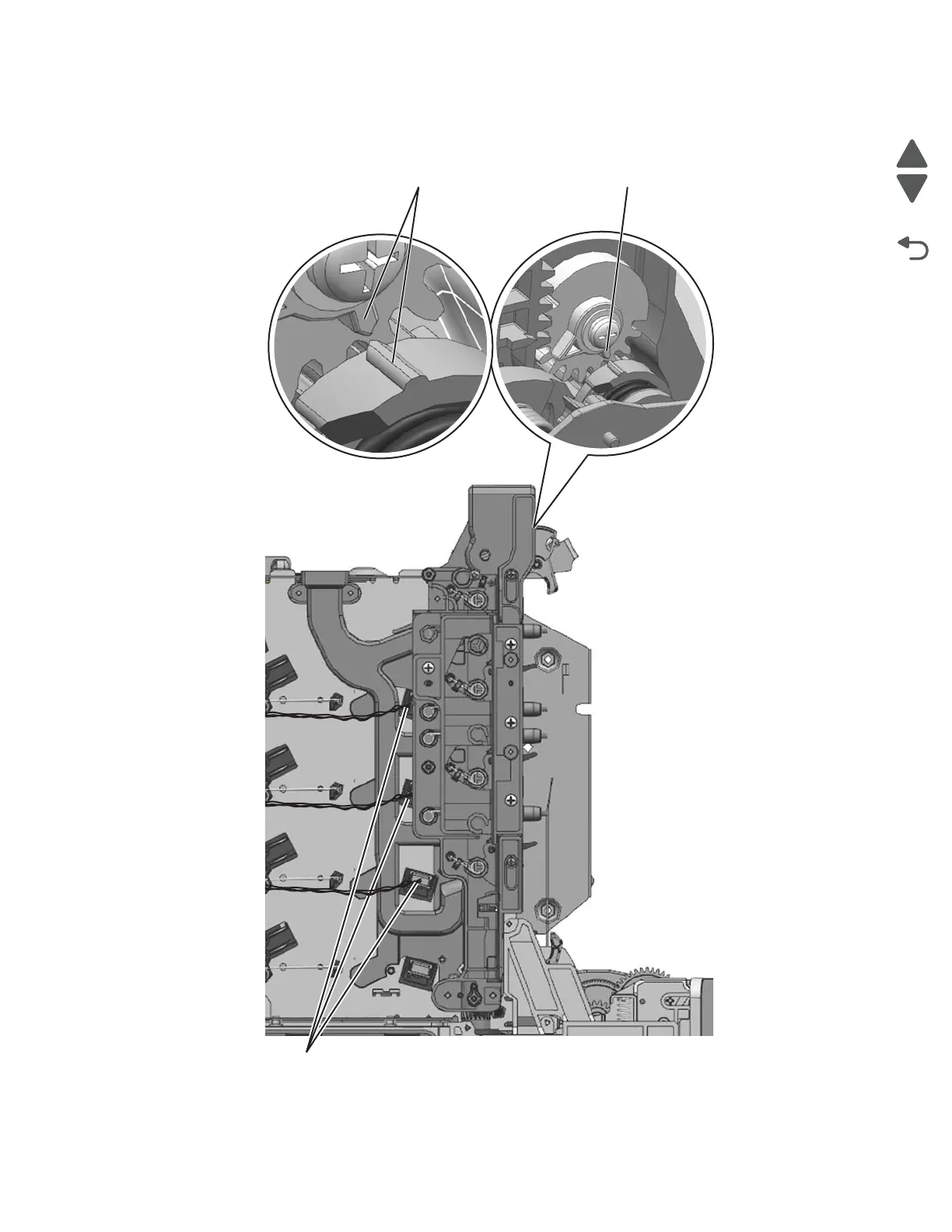 5. Install the waste toner HV contact assembly into place. Route the toner level sensor cables (E) through the