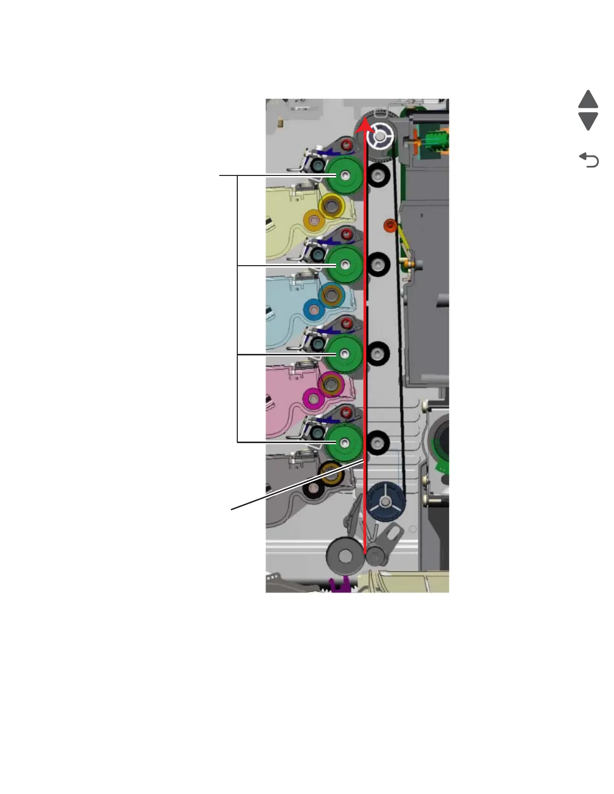 Once the paper is fed onto the transfer belt, the photoconductor drums in conjunction with the transfer belt pull