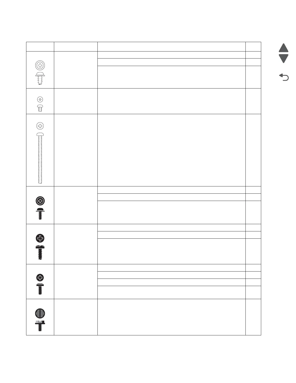Screw identification table (continued)