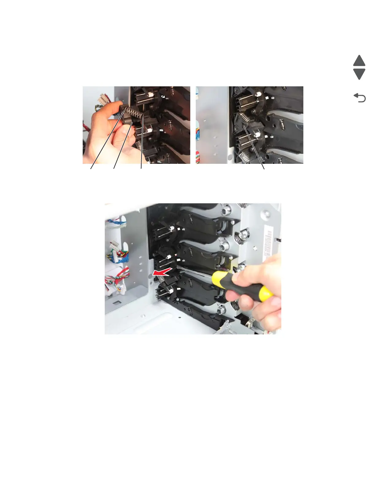 bell crank link to the mounting pin on the cartridge guide (E), and guide one end of the spring onto the
