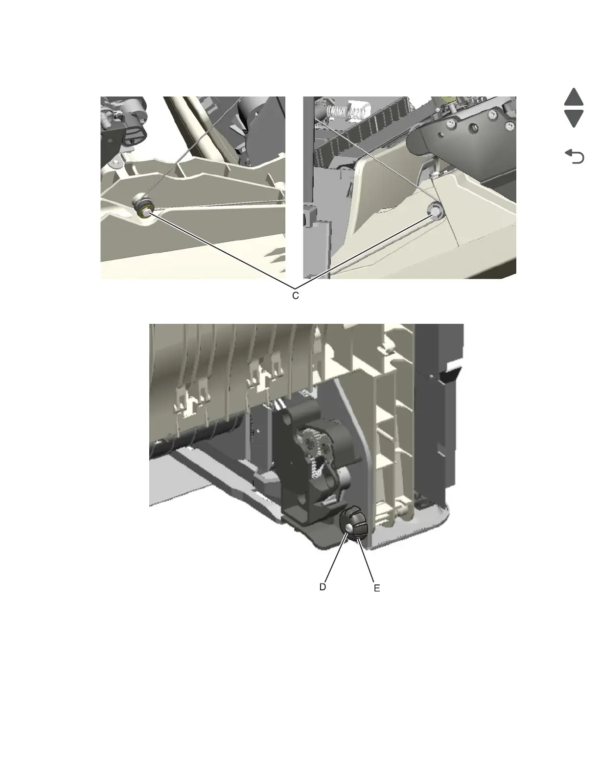 8. Close the front door assembly, and remove the mounting screw (D) and the cap (E).
