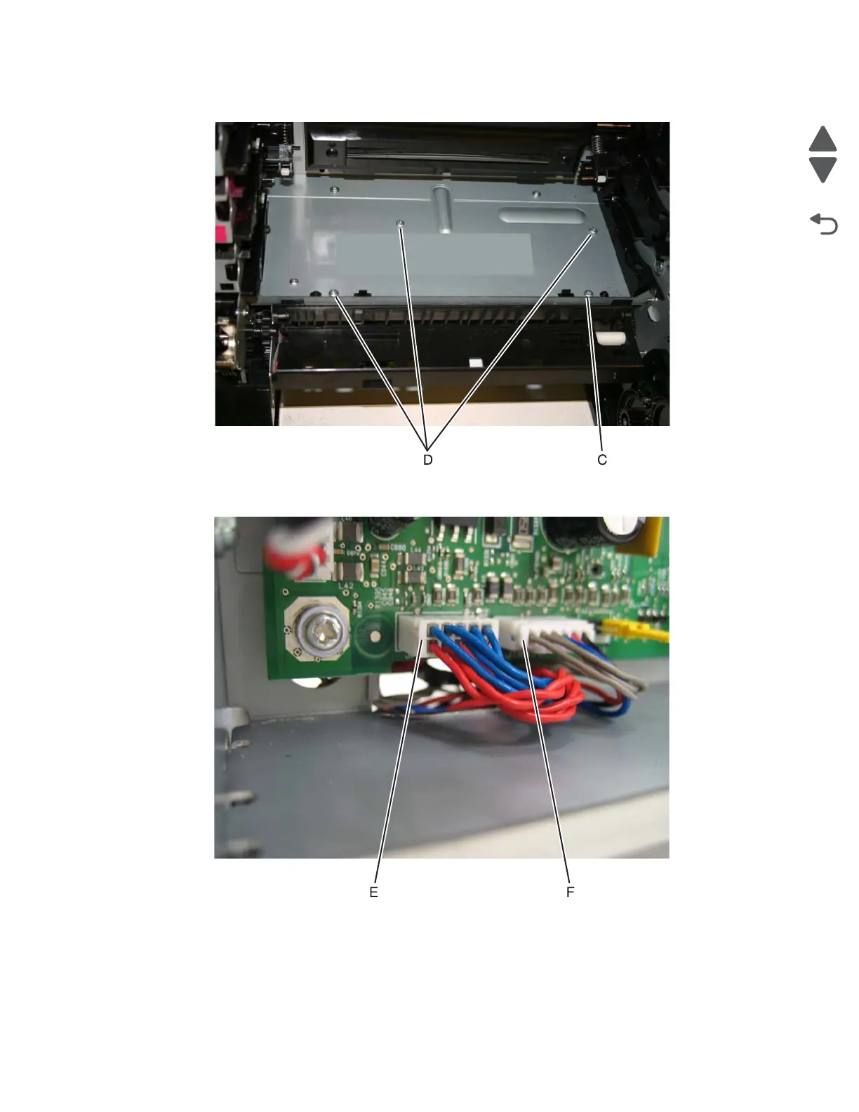 12. Route the cables through the hole in the frame, and connect them to JFDPCK1 (E) and JTRAY1 (F).