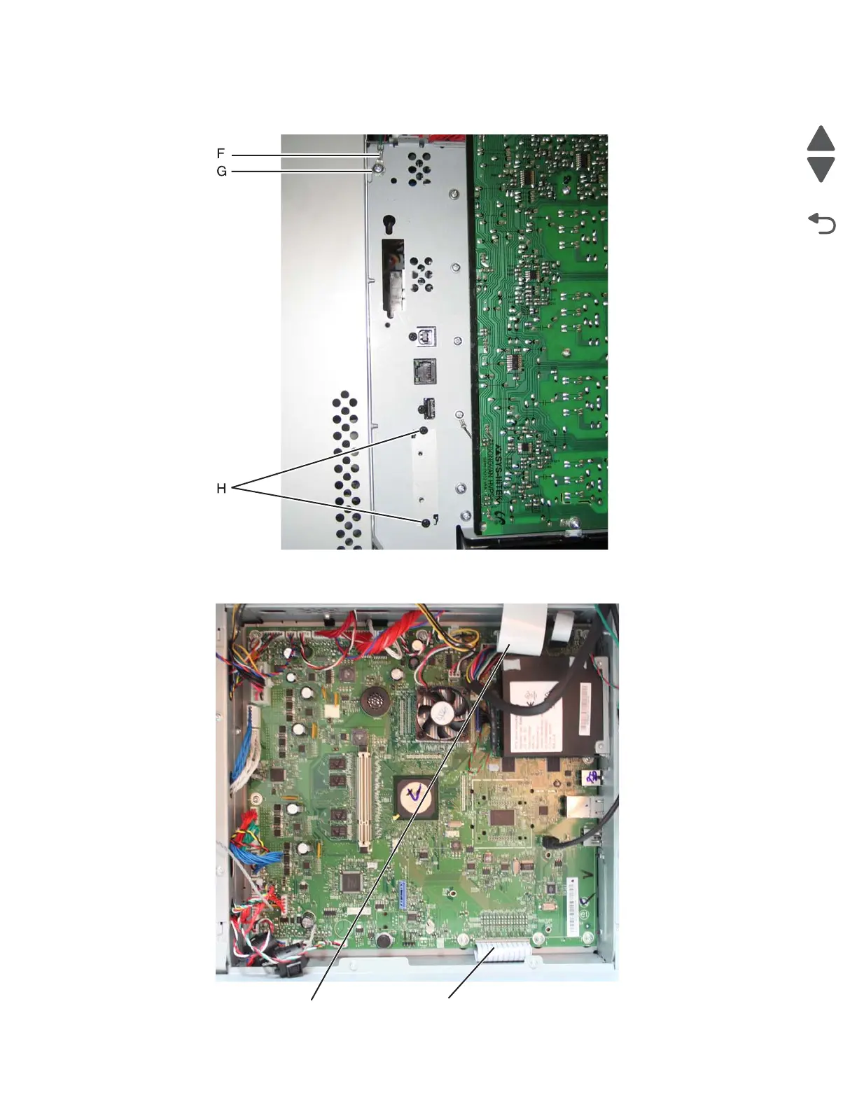 d. Replace the ground strap (F) on the screw (G), and tighten the screw.