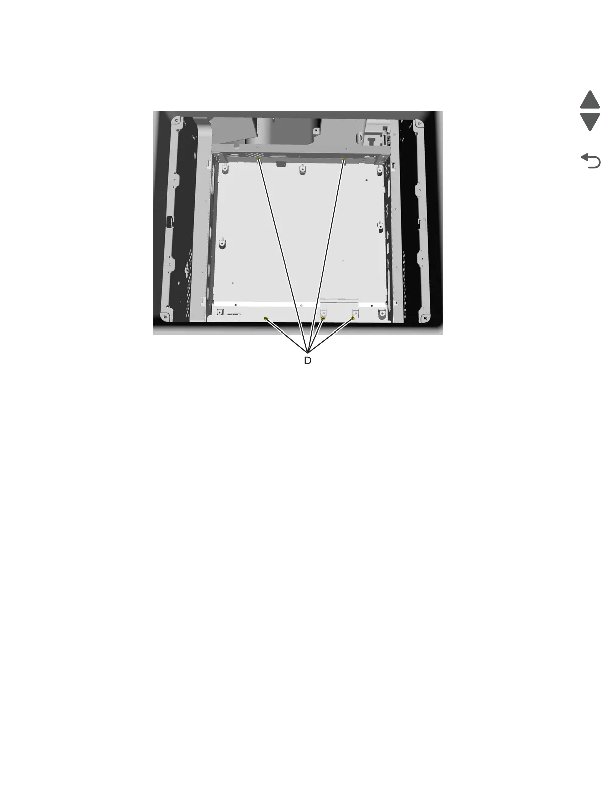 6. Remove the five mounting screws (D) from the top and bottom of the support shield.