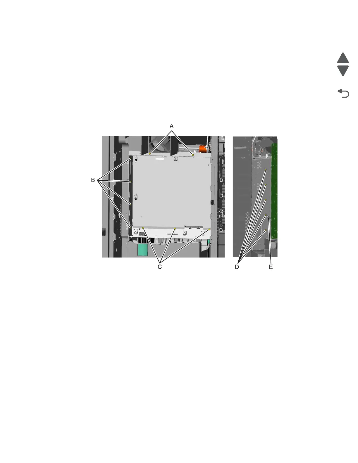 • Replace the five mounting screws (D) to the outer left side of the printer.