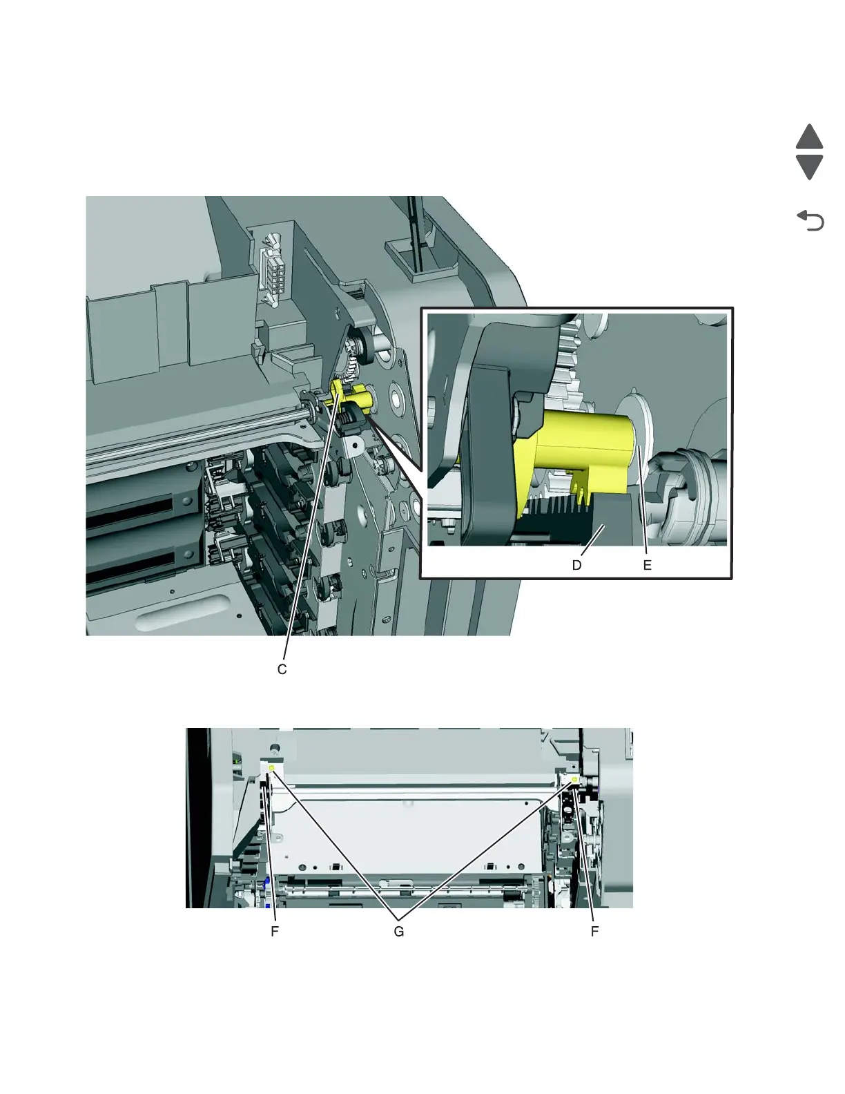 3. Flex the EP drive on the right to seat the end of the shaft into the boss (E) on the EP drive.