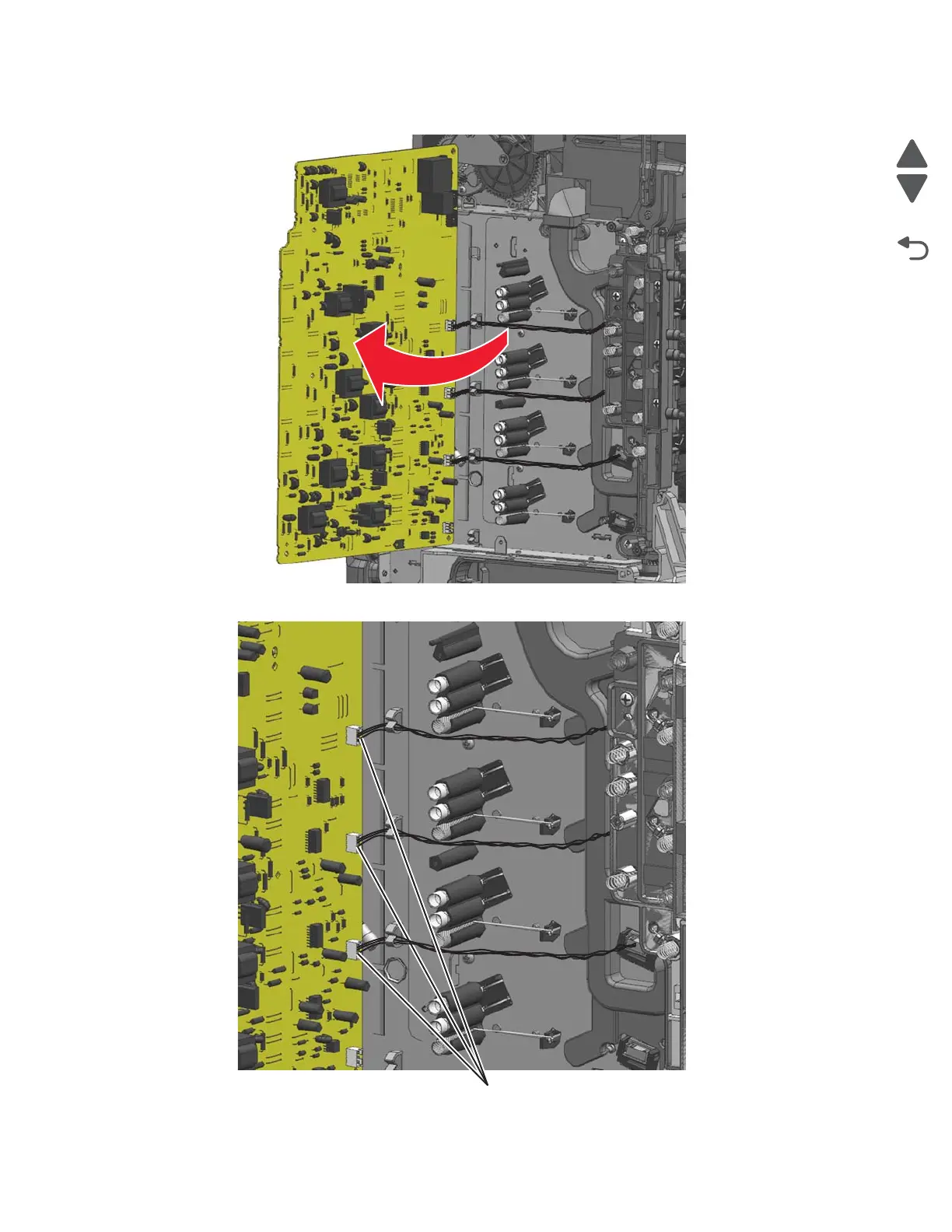 8. Disconnect the three top toner level sensor cables (F) from the HVPS.