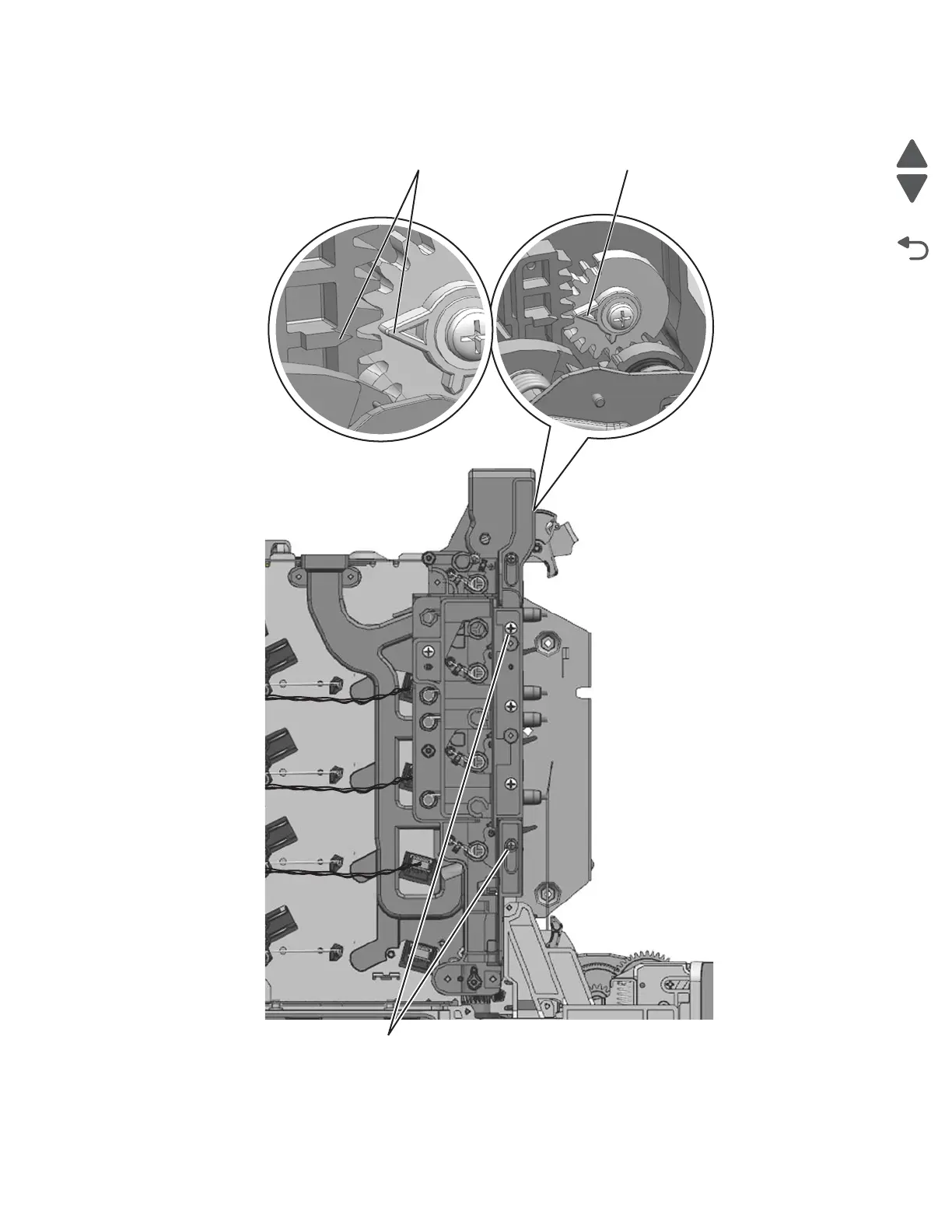 7. Use two screws (F) to attach the cleaner shutter actuator to the Waste toner HV contact assembly. Make