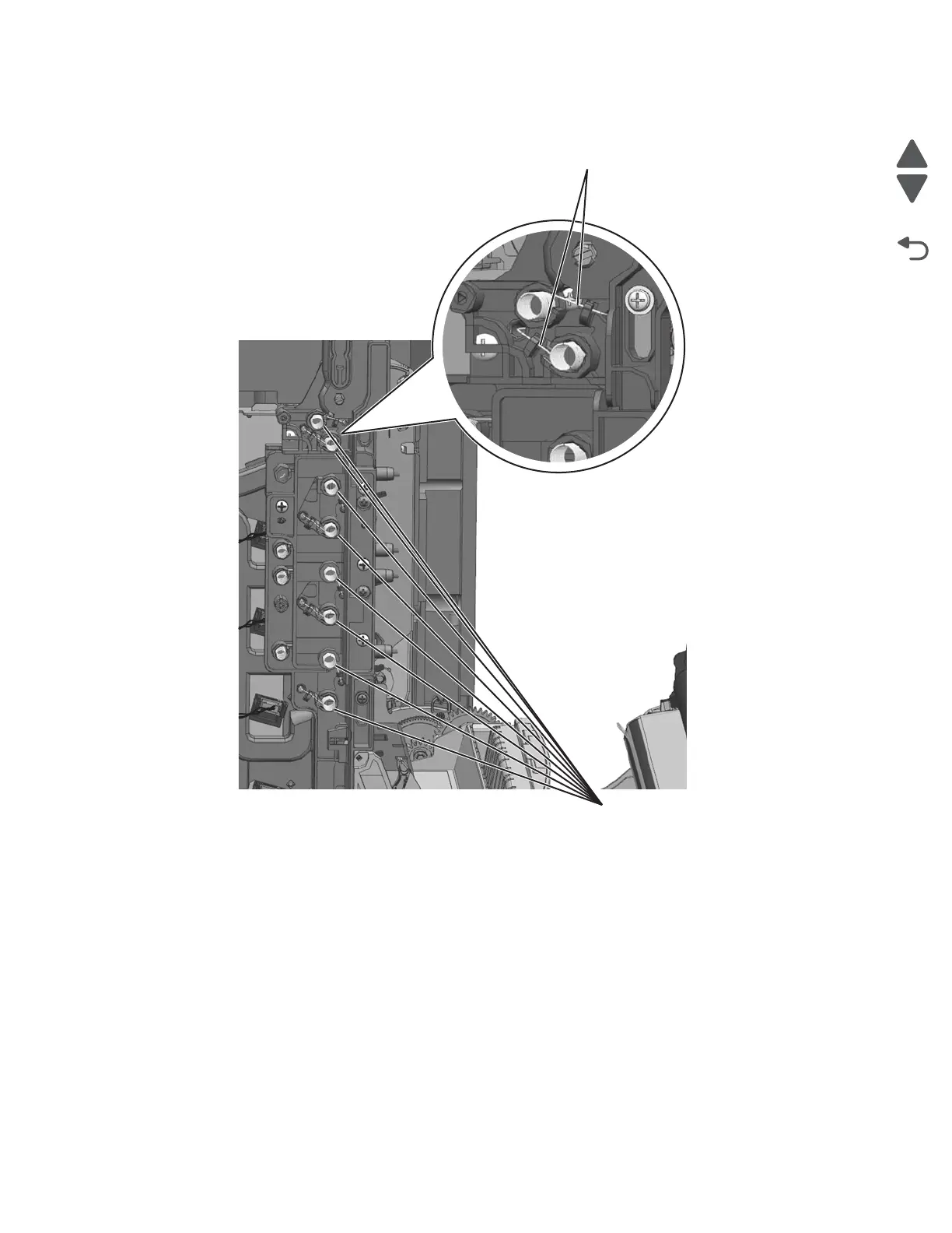 8. Attach the eight springs (G) to the Waste toner HV contact assembly as shown. Make sure the springs are