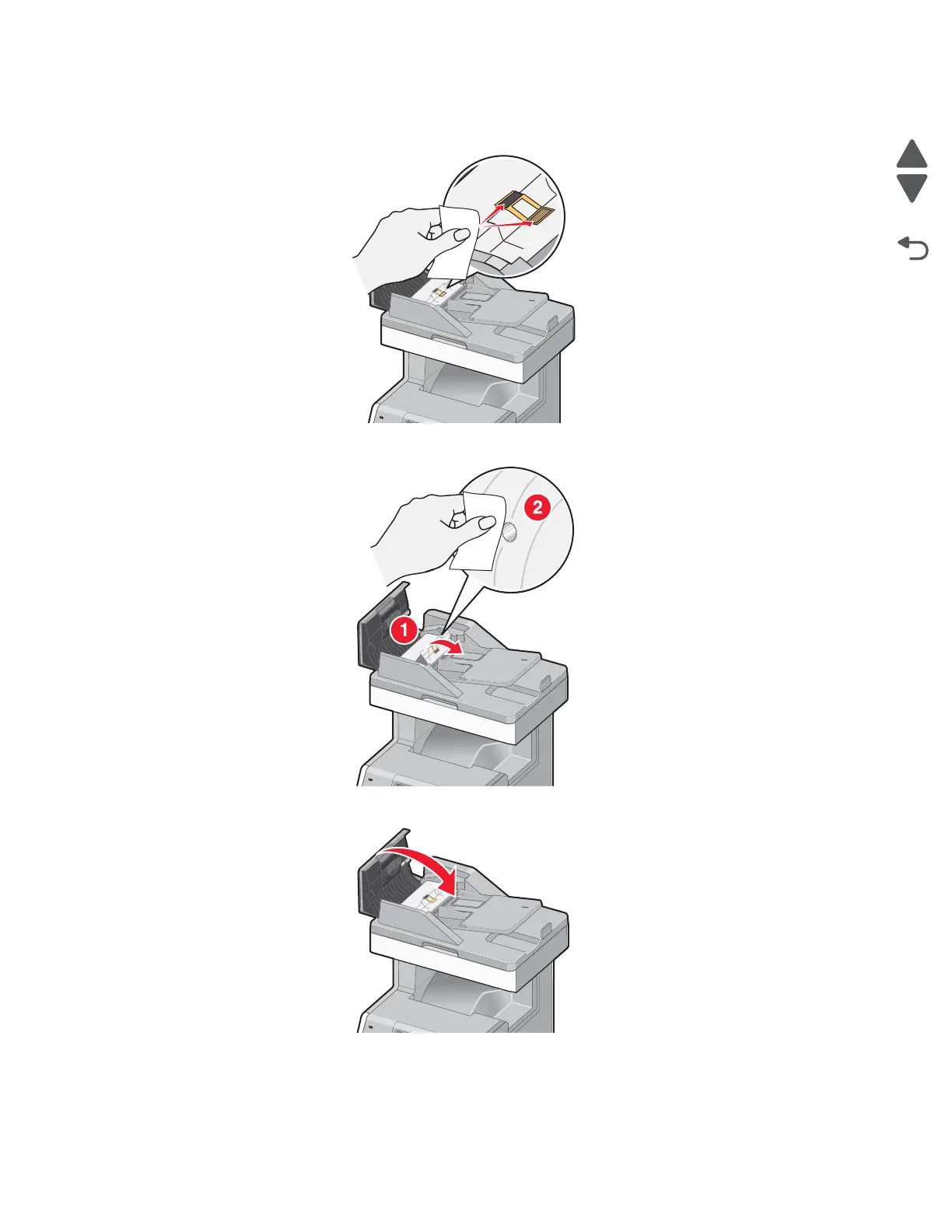 7. Wipe the entire surface under the ADF cover, including the two small white rollers.