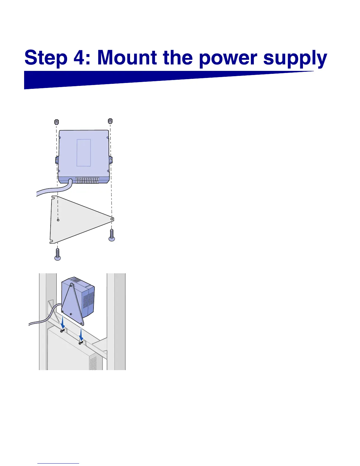 2 Attach the power supply to the bracket with two nuts and bolts.