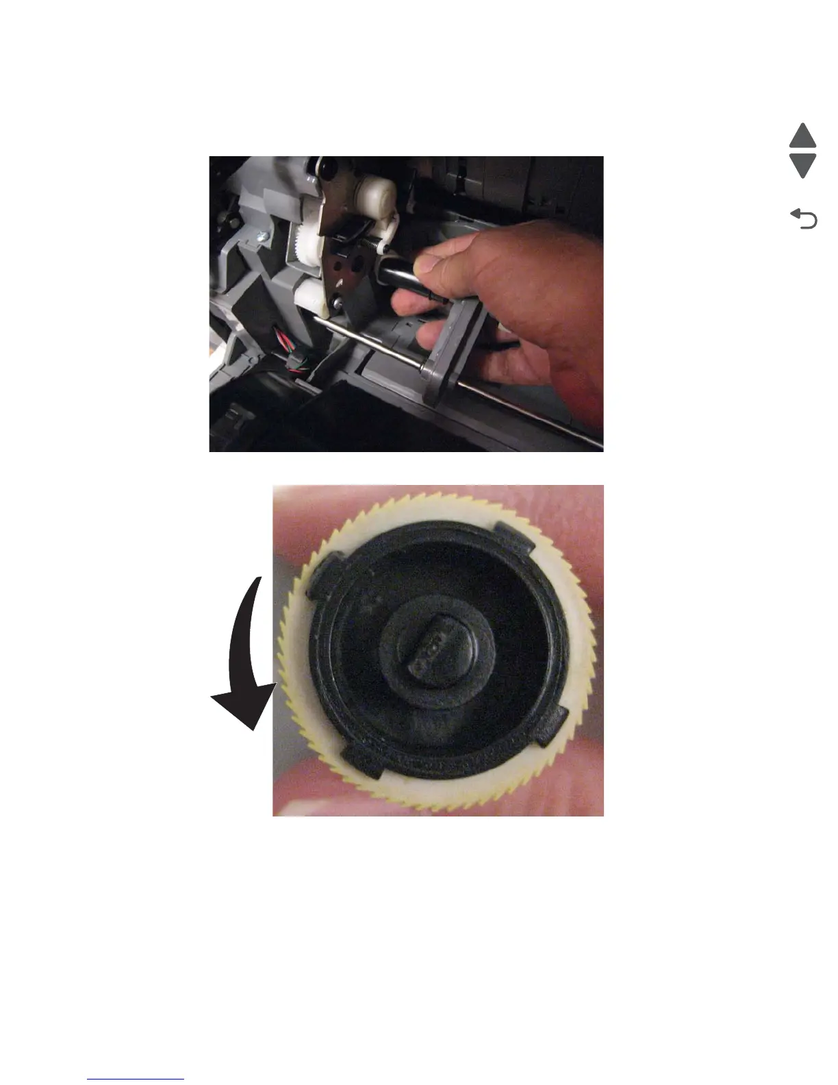 Slide the edge of a pick tire between the rear hub extension and the printer frame, and then slide the