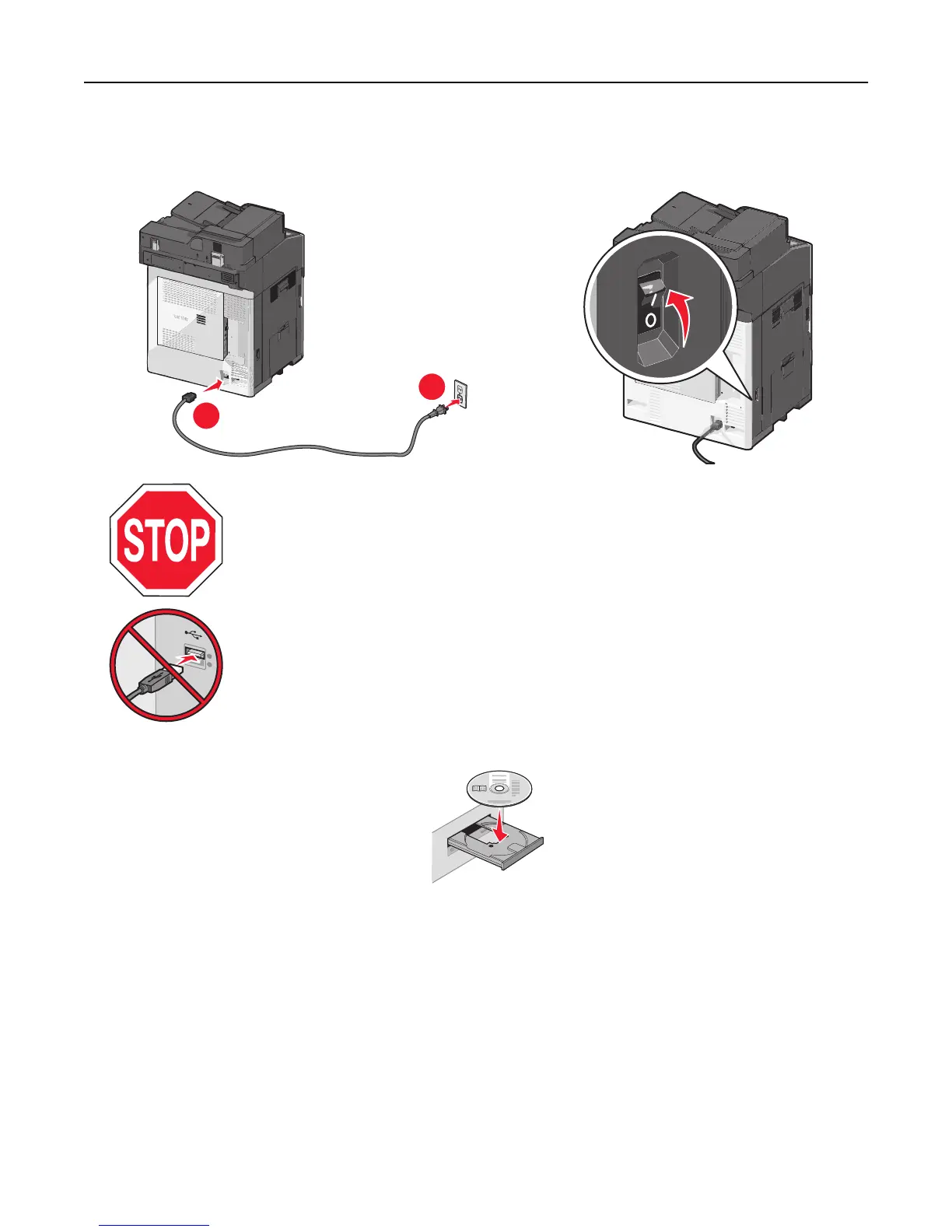 1 Connect the power cable to the printer and then to a properly grounded electrical outlet, and then turn the printer